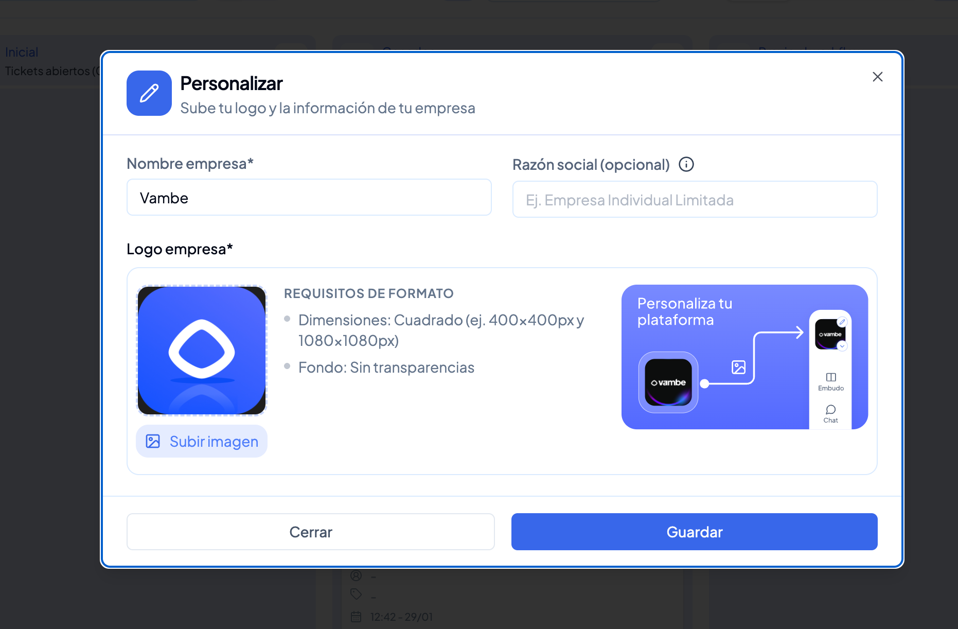 Los Super Admins y Owners ya pueden personalizar la plataforma subiendo el logo de su empresa, el cual reemplazará el logo de Vambe en la sidebar.