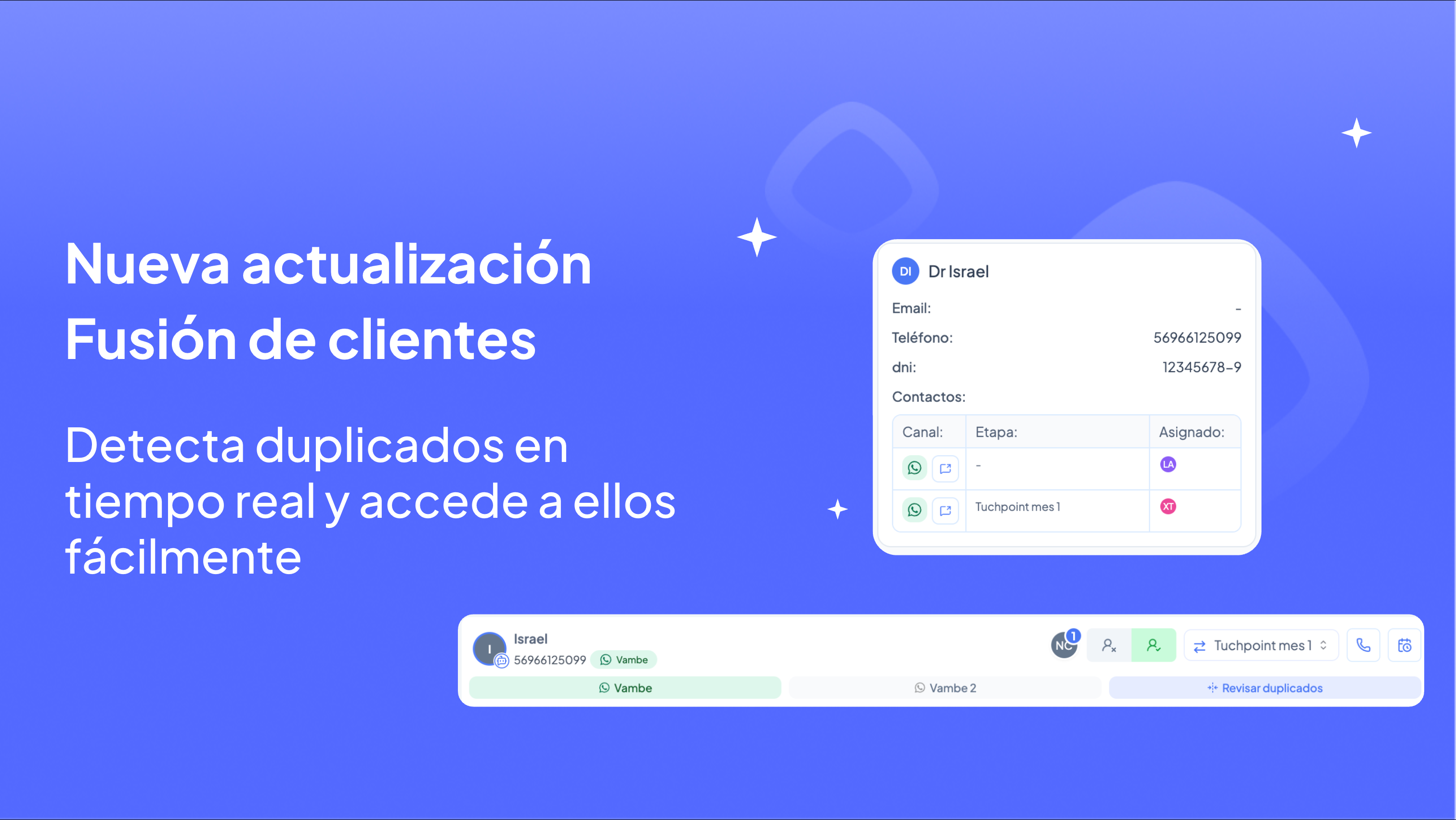 Nuestra plataforma analiza constantemente coincidencias en campos clave como teléfono, correo electrónico o identificadores personalizados.