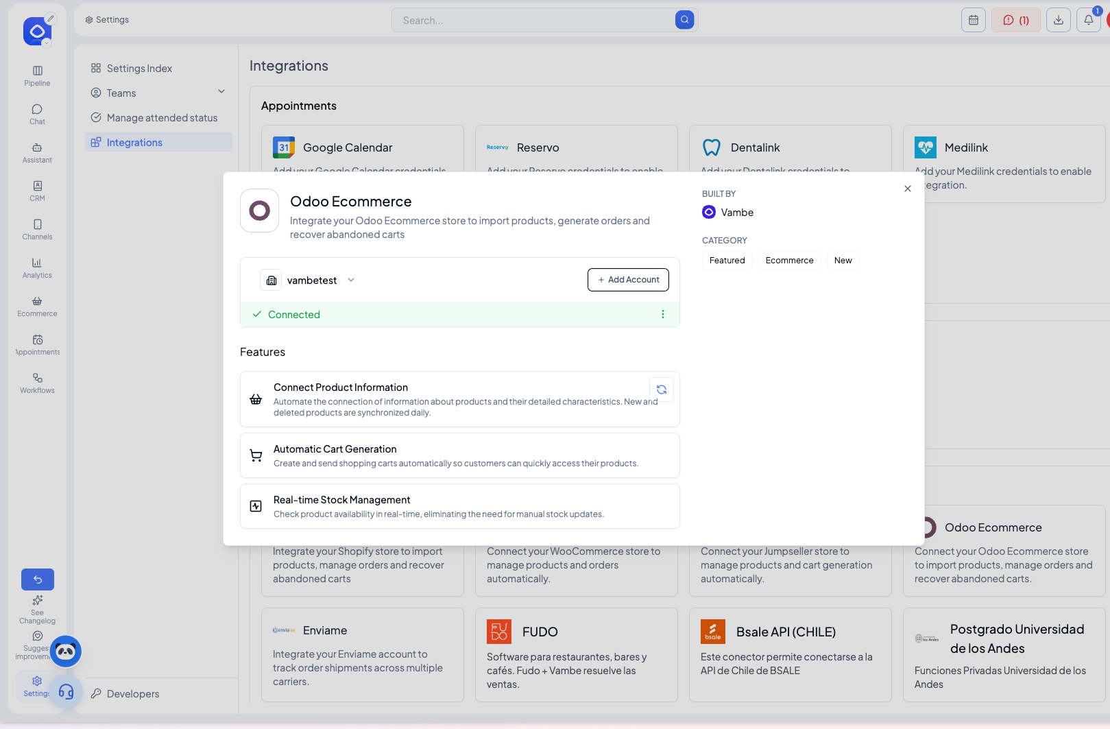 Continuamos expandiendo nuestro ecosistema de integraciones para que puedas vender más y mejor. Nos complace anunciar que Odoo E-commerce ya está disponible en Vambe.